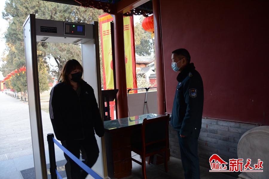 在胡氏古民居,保卫员靳鹏鹏在入口处对每一位进门的游客测体温,查看健康码。因疫情防控需要,从去年开始,除了巡逻和演练,这是他们又增加的一项工作。