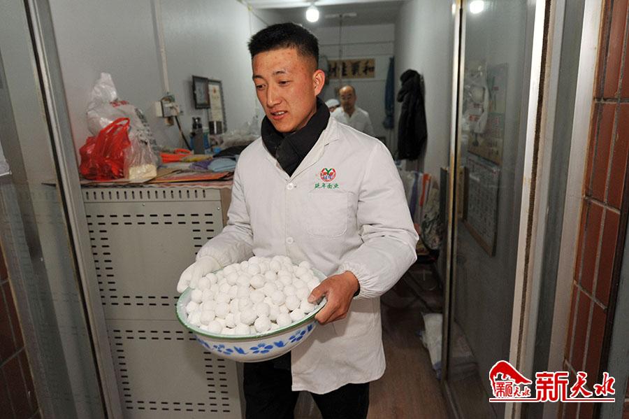 2月24日,农历正月十三,秦州区一家老字号元宵店的员工在手工制作元宵。