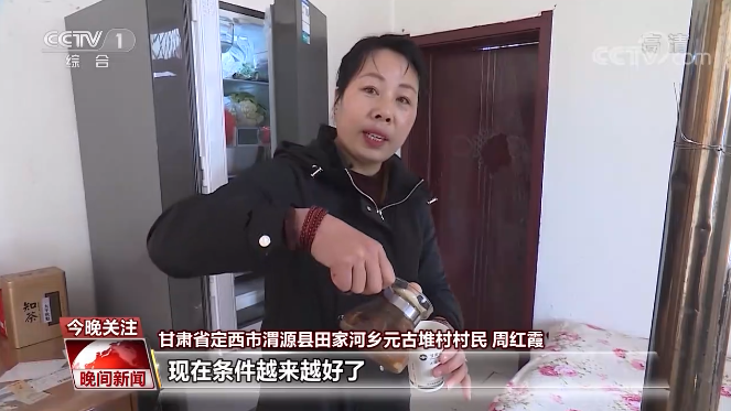 甘肃省定西市渭源县田家河乡元古堆村村民 周红霞:你看我8年前还住的这种土坯房,条件也特别差。这几年在药厂上班一年能挣三万六,电视、冰柜都买上了,水也拉到厨房了,现在条件越来越好了。