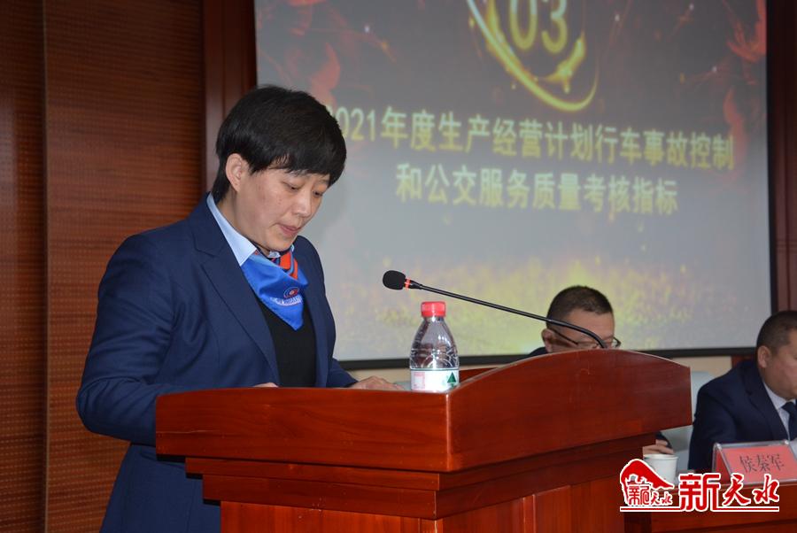 (天水羲通公交旅游集团总会计师戴丽宣读《2021年度生产经营计划行车事故控制和公交服务质量考核指标》)