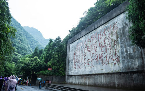 游客从刻有《忆秦娥·娄山关》的石壁前经过(2019年7月4日摄)。新华社记者 陶亮 摄