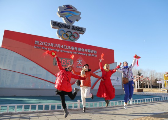 2月4日,张家口市民在市民广场的冬奥会倒计时装置前合影留念。 马佳琦、徐建平摄