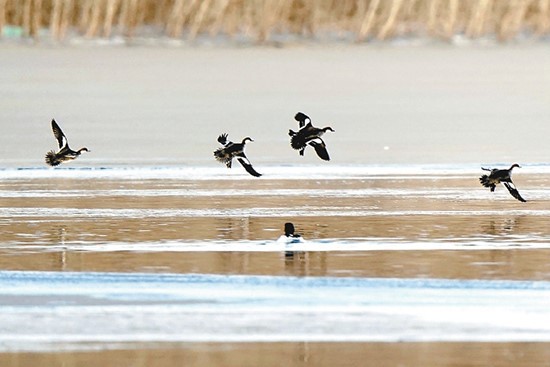在园博园园博湖附近,鸟儿迎着日出展翅飞翔。随着永定河生态环境越来越好,已有十几种野生鸟类活跃在周边。 北京日报记者 刘平摄