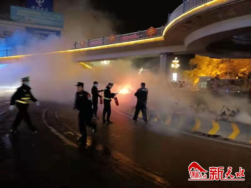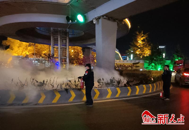 当民警巡逻至桥南盘旋路口时,发现桥下的花坛内火光冲天,烟雾弥漫,民警立即停车查看。由于天干物燥,火势蔓延很快,眼看就要烧到路灯和桥上的电线。情势紧急,民警立即一边疏散围观群众,一边到附近的滨河大酒店借来灭火器,迅速展开灭火。经反恐队员十几分钟的奋力扑救,火势终于被扑灭,避免了更大火灾事故的发生。
