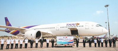 2月24日,泰国订购的首批中国科兴新冠疫苗运抵首都曼谷素万那普机场。泰国总理巴育、副总理兼公共卫生部长阿努廷等赴机场迎接。新华社记者 张可任摄