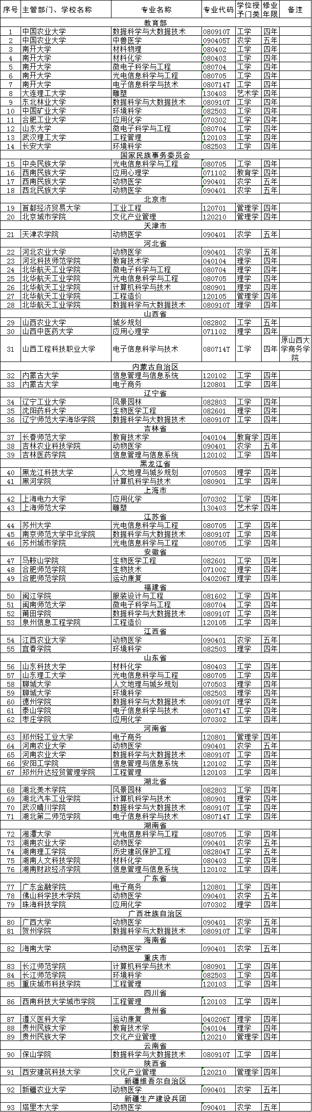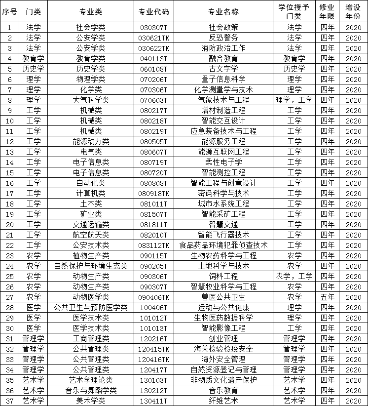 列入普通高等学校本科专业目录的新专业名单