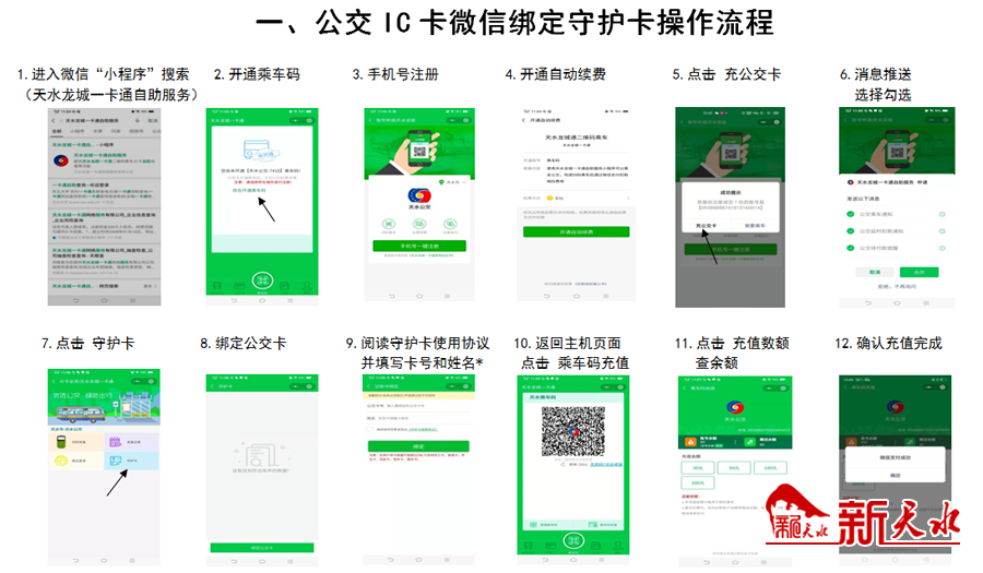 1.进入微信“小程序”搜索(天水龙城一卡通自助服务); 2.开通乘车码; 3.手机号注册;4.开通自动续费; 5.点击充公交卡;6.消息推送选择勾选;7.点击守护卡;8.绑定公交卡; 9.阅读守护卡使用协议并填写卡号和姓名;10.返回主机页面点击乘车码充值;11.点击充值数额查余额;12.确认充值完成。
