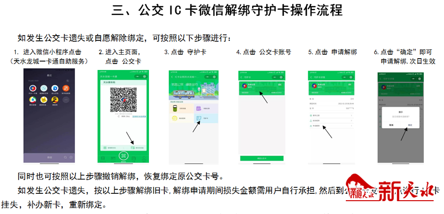 1. 进入微信小程序点击 (天水龙城一卡通自助服务); 2.进入主页面点击公交卡;3.点击守护卡; 4.点击绑定的卡号; 5.点击申请解绑;6.点击“确定”即可申请解绑,次日生效。