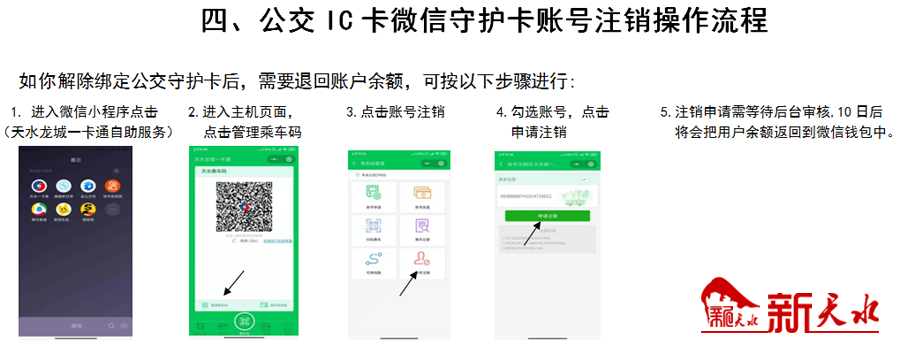 1. 进入微信小程序点击(天水龙城一卡通自助服务);2.进入主机页面点击管理乘车码;3.点击账号注销; 4.勾选账号点击申请注销;5.注销申请需等待后台审核;10日后将会把用户余额返回到微信钱包中。