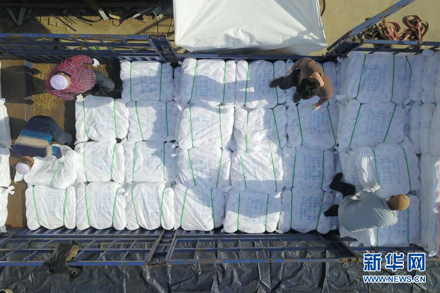 3月3日,在东乡族自治县方大丽明纺织有限公司扶贫车间,工人们将涤纶缝纫线产品装车(无人机照片)。新华社记者 范培珅 摄