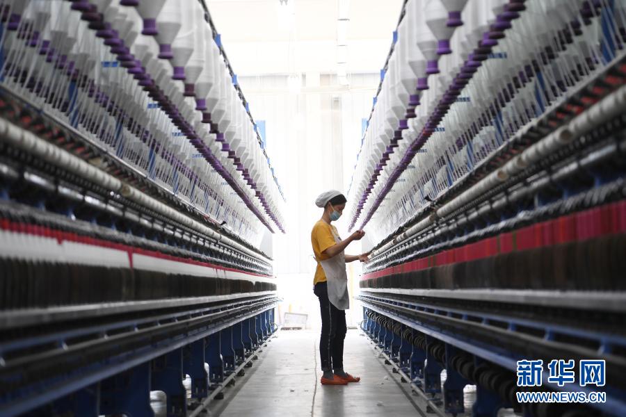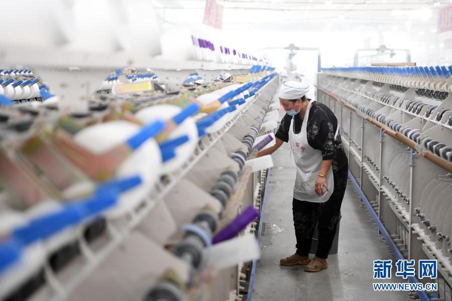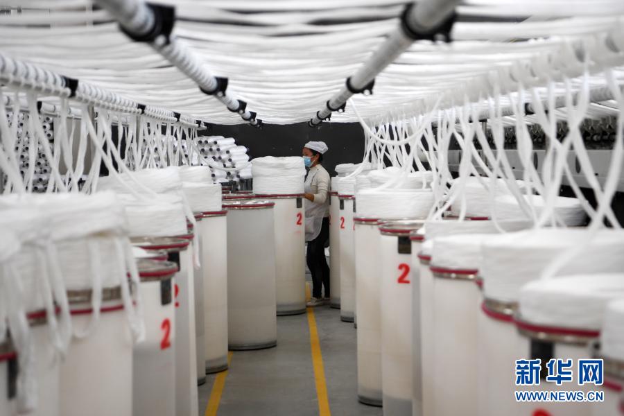 3月3日,在东乡族自治县方大丽明纺织有限公司扶贫车间,工人在涤纶缝纫线产品生产线上忙碌。新华社记者 范培珅 摄