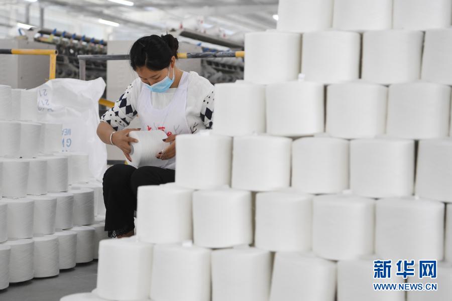 3月3日,在东乡族自治县方大丽明纺织有限公司扶贫车间,工人检验涤纶缝纫线产品。新华社记者 范培珅 摄