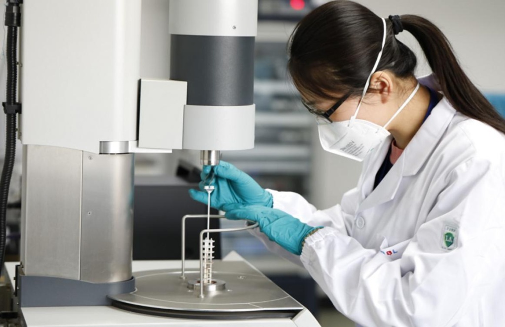 图为科研人员正在对深水恒流变合成基钻井液添加剂进行化验分析。(中海油田服务股份有限公司 供图)