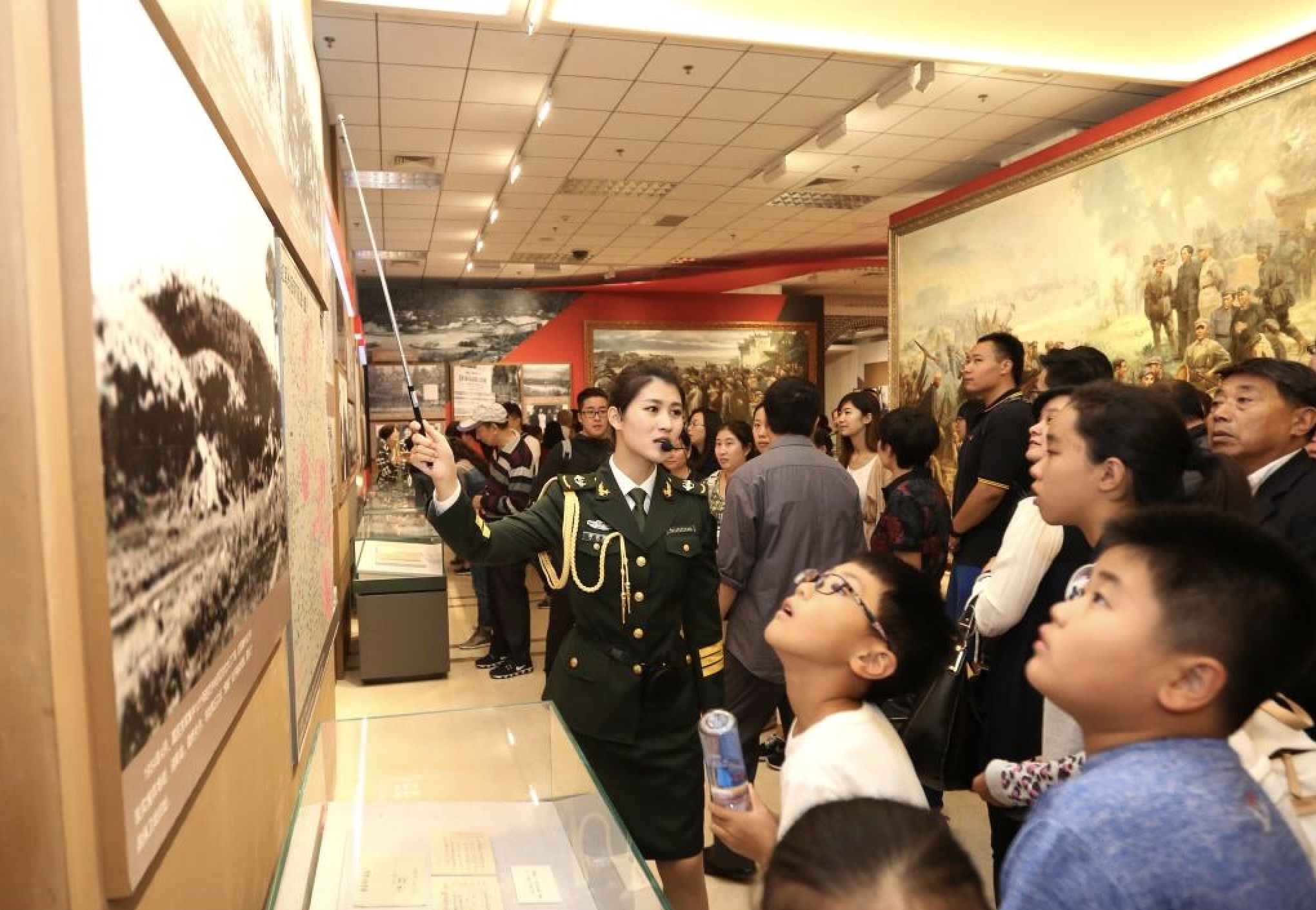 △北京中国人民革命军事博物馆开放“英雄史诗 不朽丰碑——纪念中国工农红军长征胜利80周年主题展览”,解说员在为参观者讲解。