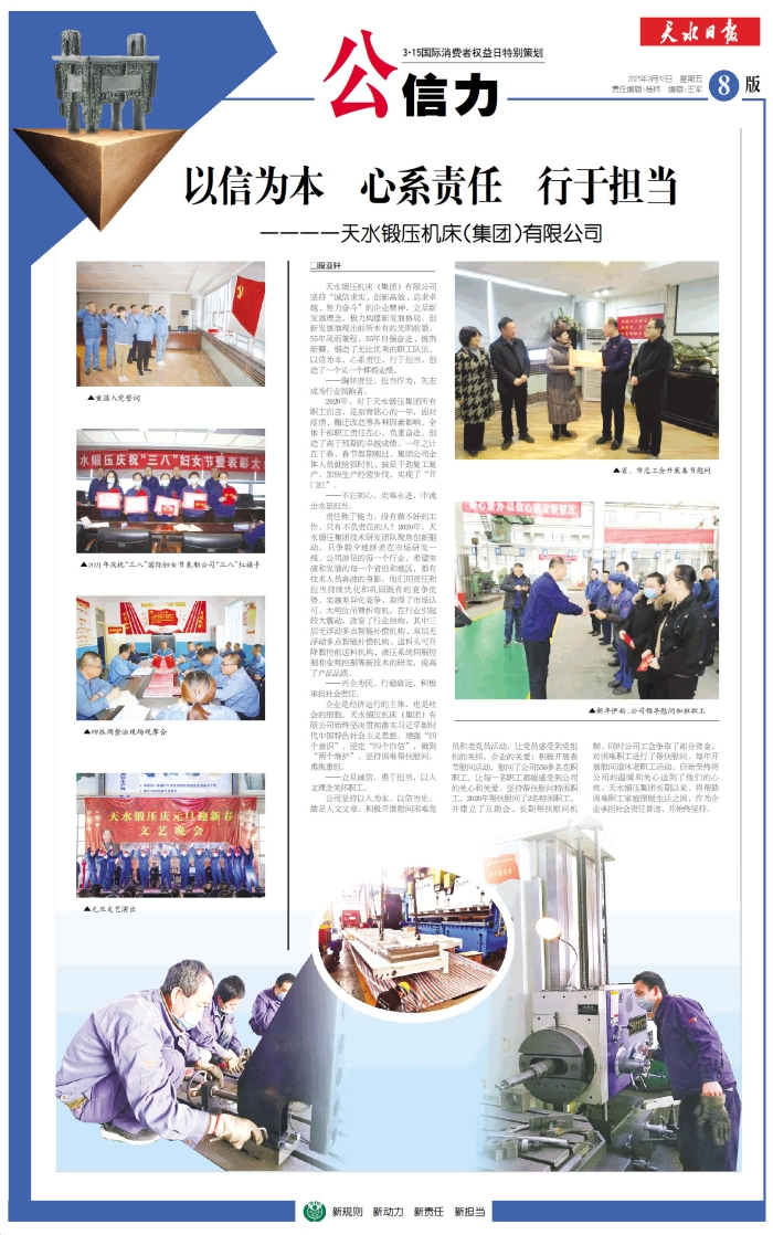 公信力|天水锻压机床(集团)有限公司:以信为本 心系责任 行于担当