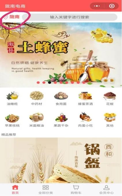 第二步:当进入陇南电商微信小程序后,在下图描红处点击