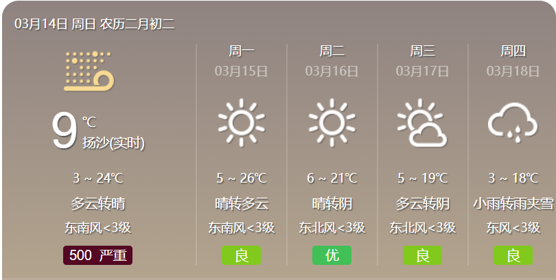3月15日夜间到3月16日白天,陇南、天水、平凉三市阴间多云,部分地方有小雨;白银、定西、甘南、庆阳等市州多云间阴,局部地方有小雨(雪);省内其余地方多云,酒泉、嘉峪关两市有5-6级偏东风。