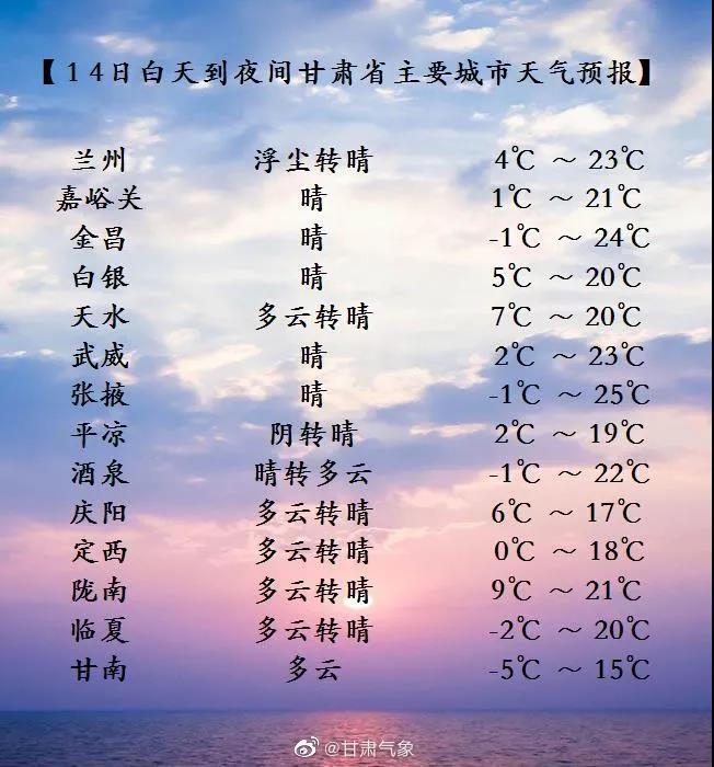 13日夜间到14日白天,陇南、天水、平凉三市多云间阴,局部地方有小雨;省内其余地方晴间多云,河西五市有4-5级西北风。