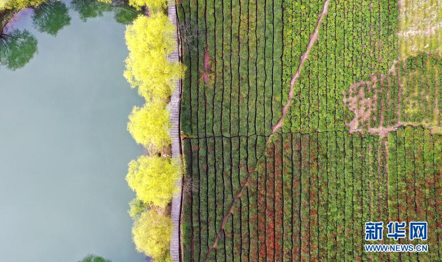 茶农在文县碧口镇马家山村的茶园里采摘春茶(3月14日摄,无人机照片)。新华社记者 陈斌 摄
