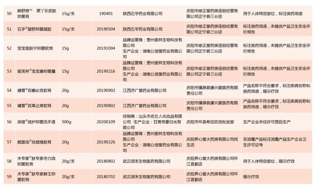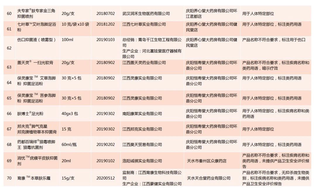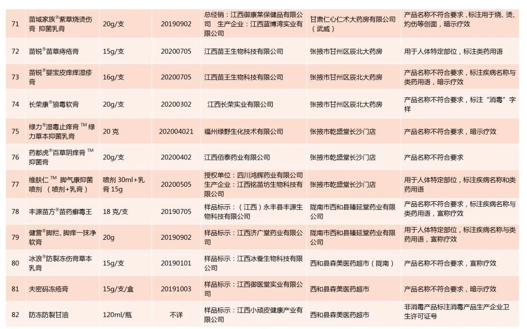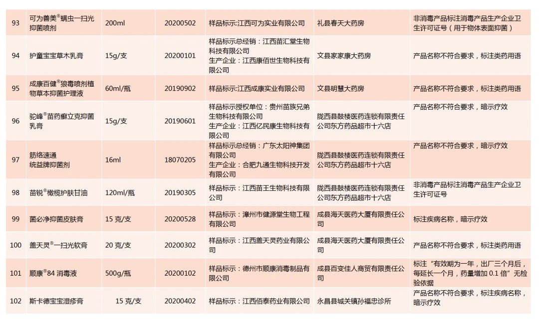 全省卫生健康监督机构共检查消毒产品经营单位3362家,抽查消毒产品5027个,发现不合格消毒产品102种,对违法经营单位共立案79起,罚款19.01万元。不合格原因主要是:产品名称不符合要求,标注疾病名称或类药用语,暗示疗效;标注用于人体足部、鼻黏膜、眼睛、肛肠等特定部位,宣传或暗示疗效;非消毒产品标注消毒产品生产企业卫生许可证号,误导消费者;生产企业未经许可擅自生产,产品质量无法保证;还有其他违法行为,如标注无检验依据的有效期,应标注的内容标注不全影响使用,抗抑菌制剂标注用于破损皮肤黏膜、伤口等禁止标注的内容等。