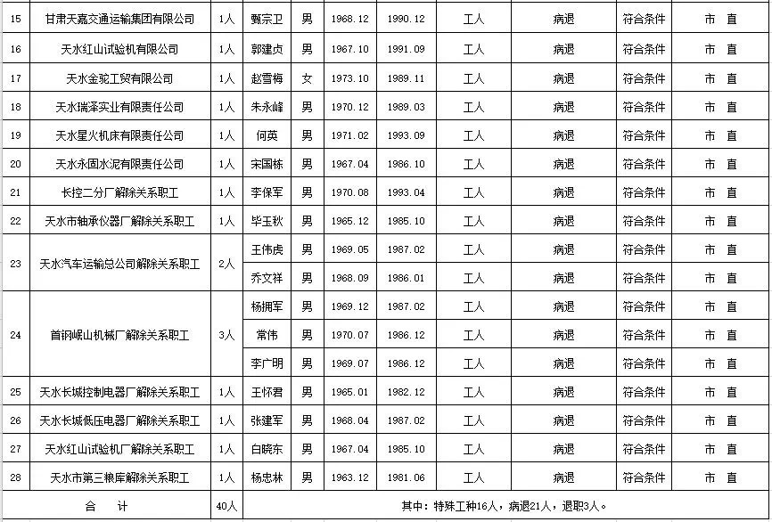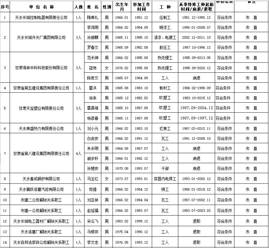根据人力资源和社会保障部《关于进一步加强企业特殊工种提前退休管理工作的通知》(人社部发﹝2018﹞73号)文件精神,现将2021年第二批经审核拟办理提前退休手续的40名企业城镇职工有关情况予以公示,接受社会监督。如发现影响办理提前退休手续的问题,可通过电话、来信、面谈等形式反映,我们将认真进行受理,并向署名或当面反映问题的人民群众反馈调查核实结果。如不存在影响办理提前退休手续的问题,将按有关规定办理提前退休手续。
