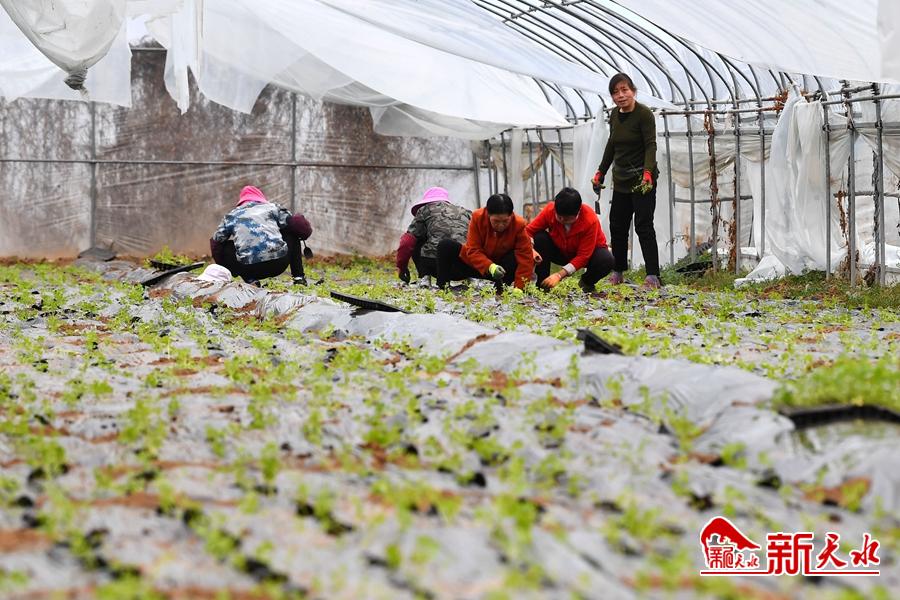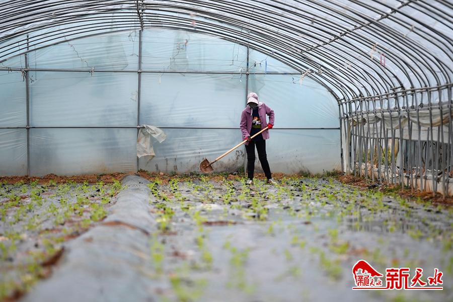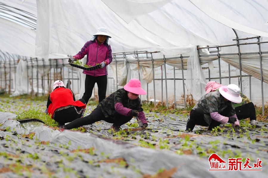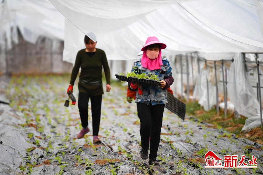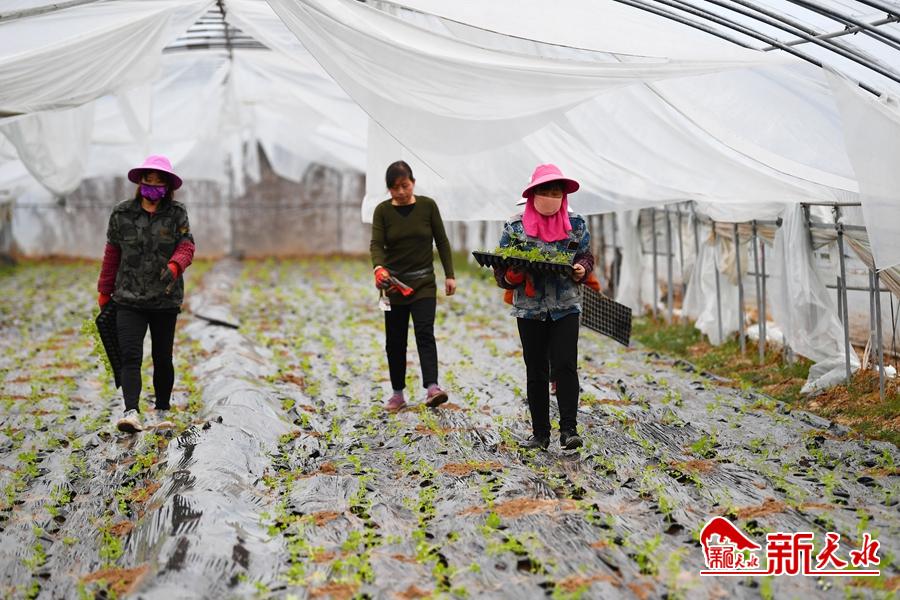 3月18日,麦积区渭南镇渭西村利丰种植农民专业合作社的蔬菜大棚里,十几个女工正在往大棚里移栽西芹苗。