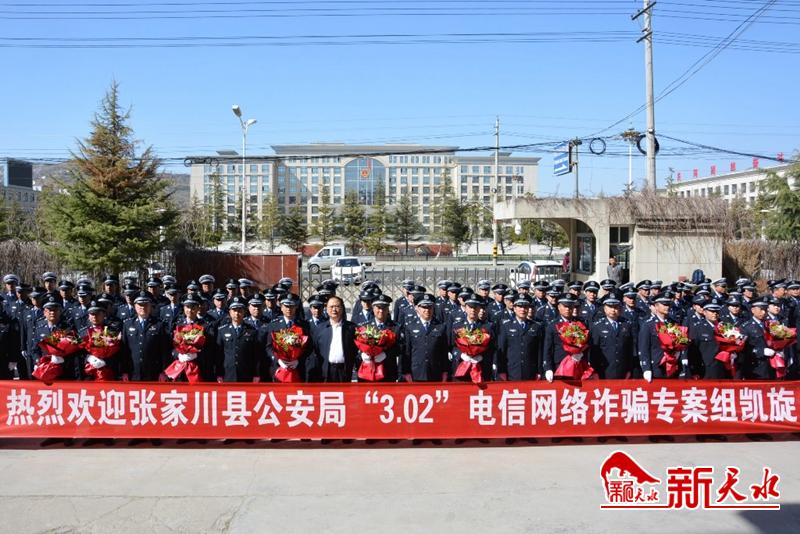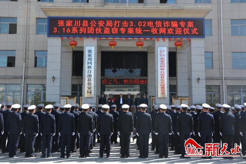 新天水讯【记者蔚军平】3月23日,张家川县公安局举行“3·02”电信诈骗案和“3·16”团伙系列盗窃案统一收网欢迎仪式。市公安局、张家川县有关领导参加欢迎仪式,并向专案组民警献上鲜花,向他们表示亲切的慰问,对县公安局打击“两类案件”取得重大战果表示祝贺。