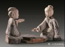 彩绘木雕博戏俑:汉代·武威市磨嘴子汉墓出土,人高29厘米。两位老者在玩博戏,这是战国到汉代非常盛行的一种娱乐形式。匠师以简单明快的艺术造型,刻画了两位老者全神贯注的博弈,惟妙惟肖地表现出对弈时蓄势待发的场面,是汉代木雕艺术中的精品之作。