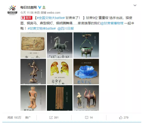 发起挑战后,#全国文物大battle#进行得如火如荼 。各家博物馆(院)、文旅、传媒纷纷晒出自家宝贝。由此,一场全国文物大比拼拉开帷幕。
