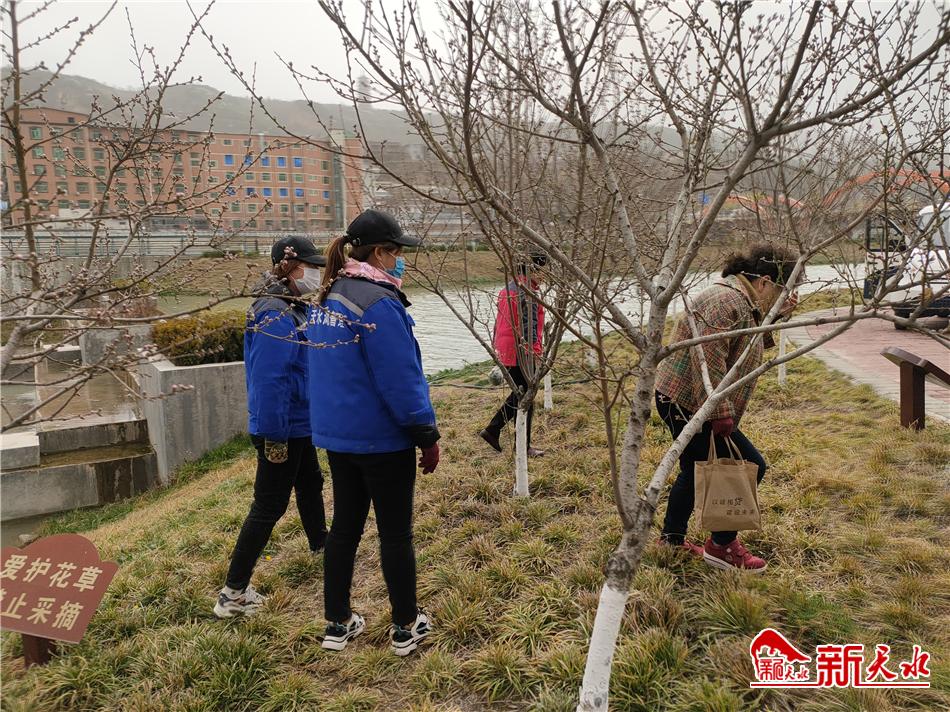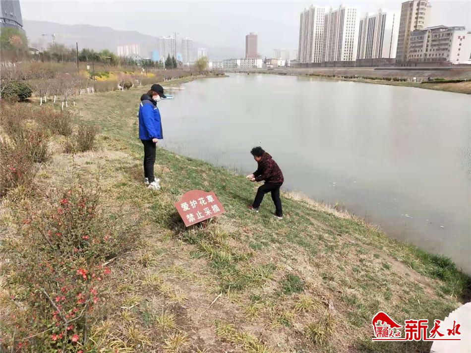 3月20日一大早,在秦州区藉河生态区,有市民正拿着小铲子、小刀等工具挖着野菜,而在她们挖菜的旁边赫然立着“爱护花草,禁止采摘”的牌子。天水湖管理处工作人员通过监控发现这两位挖野菜的老人后,立即通知了藉河风情线管理办公室大队长赵慧芳,赵慧芳连忙和两位同事赶到了挖野菜老人的位置。在她们的劝导下,两位老人最终离开了草坪。