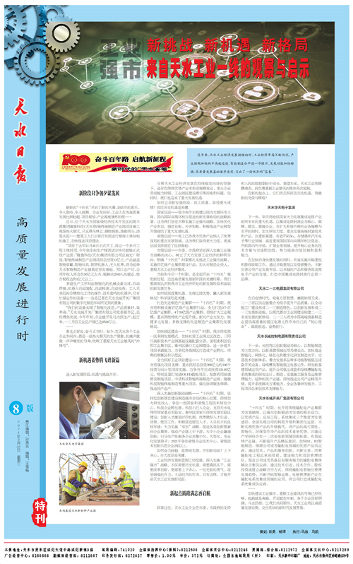 回首过往,天水工业企业在市委、市政府的支持和人民的殷殷期盼中成长。展望未来,天水工业将踌躇满志,肩负着重振工业雄风的使命再次起航。