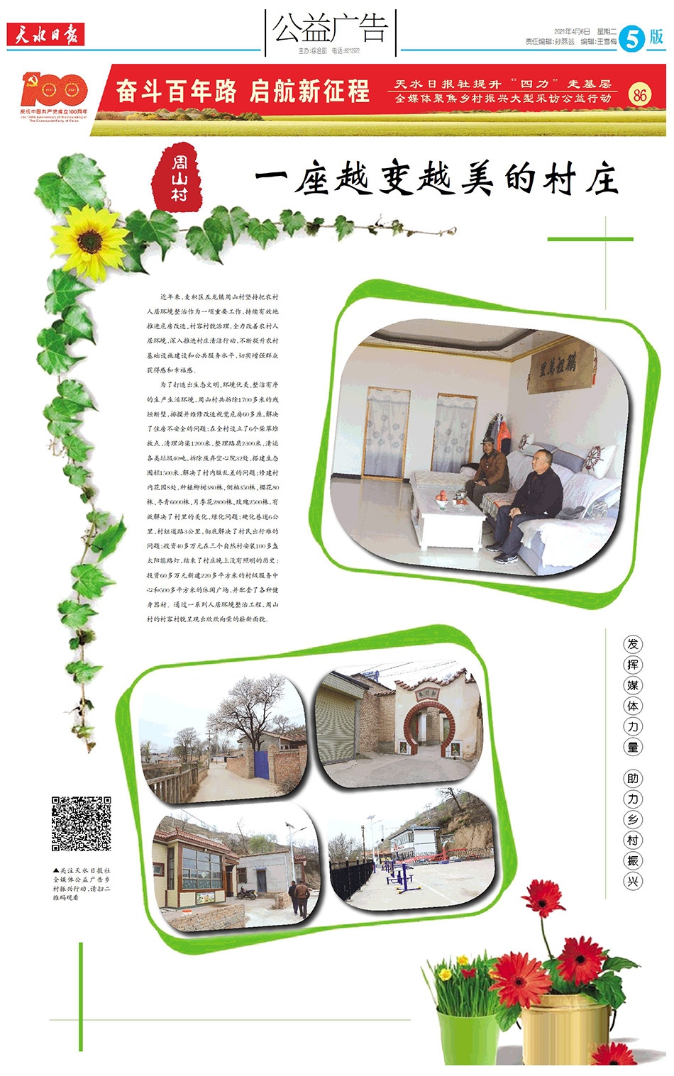 近年来,麦积区五龙镇周山村坚持把农村人居环境整治作为一项重大政治任务,持续有效地推进视觉危房改造、村容村貌治理,全力改善农村人居环境,深入推进村庄清洁行动,不断提升农村基础设施建设和公共服务水平,切实增强农民群众获得感和幸福感。