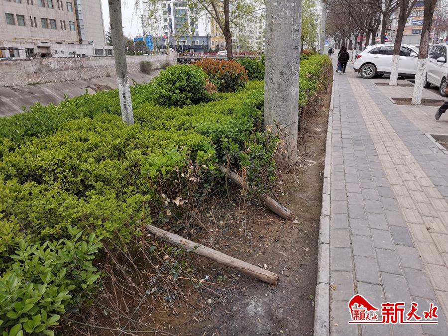 4月7日,在秦州区罗玉路,马路边原本搭起来绑铁丝网防护绿化树木的木桩有一些倾倒在地上,不仅起不到防护功能,而且有损市容市貌,望有关部门尽快处理。【夏雨 摄】