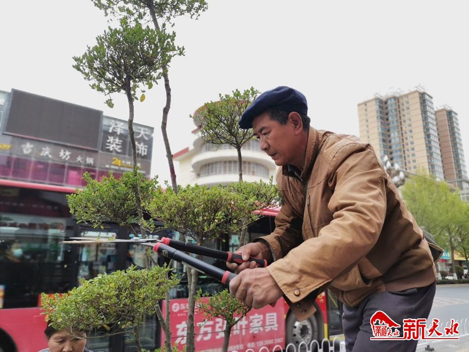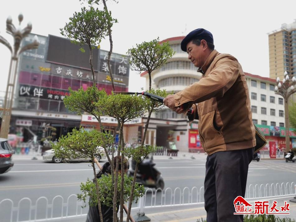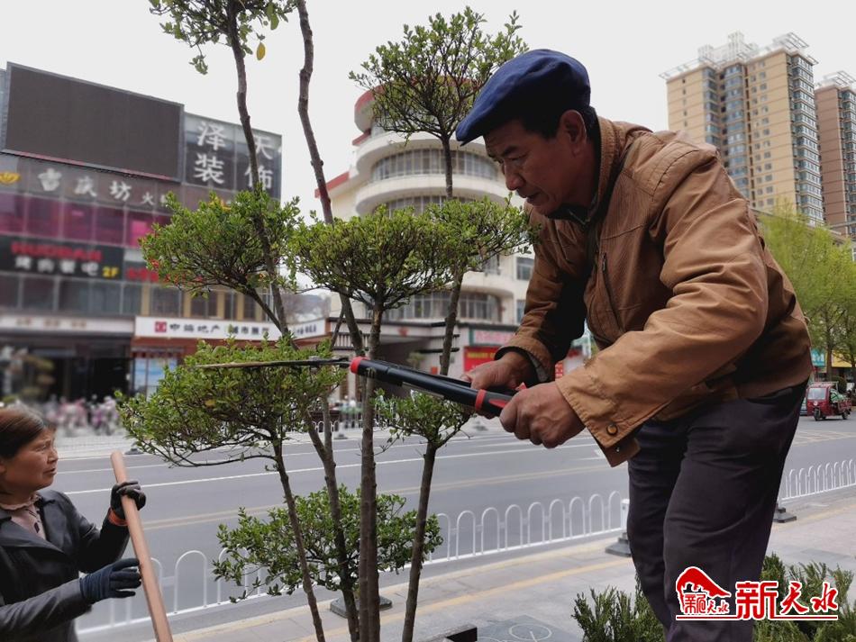 4月8日下午,园林工人在秦州区民主路正在给绿化带里的苗木“造型”,经过他们精雕细琢,一棵棵苗木展现出自然优美、苍劲古朴的造型,进一步提升了城市绿化和美化档次,给市民带来一个更好的美化环境。【新天水记者 余碧波 摄】