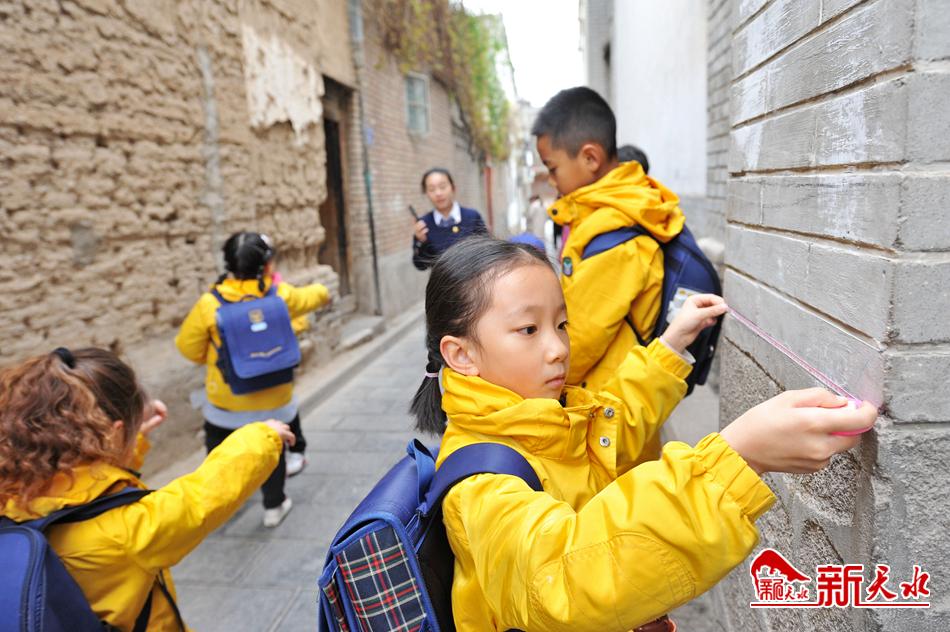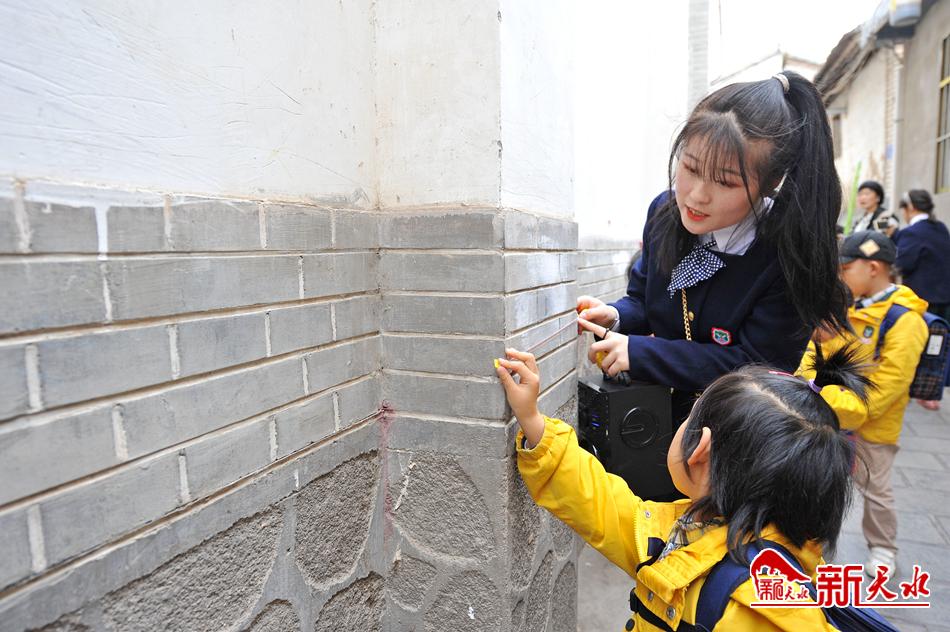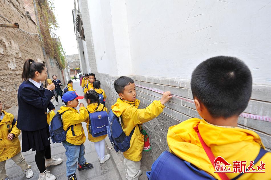 4月8日,天水市一所幼儿园的孩子们在老师的带领下参观伏羲城。并走进老巷道,用量尺测量墙砖长度,通过寓教于乐的形式感受古城天水的历史文化。【新天水记者 孙镇 摄】