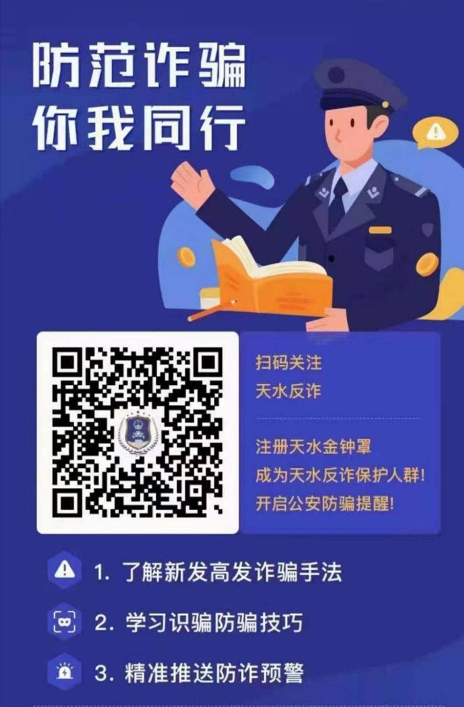 大家可通过在微信上注册“天水金钟罩”小程序,尽可能准确、完整地填写个人信息,当不法分子企图通过电话、虚假网址等多种方式实施诈骗时,就会被天水市反电信诈骗中心系统预警,将会推送防骗警示信息,及时阻止大家受骗。