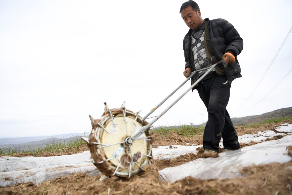 4月14日,在天水市秦州区天水镇,一名农民在合作社流转的复垦耕地上进行春耕生产。新华社记者 陈斌 摄