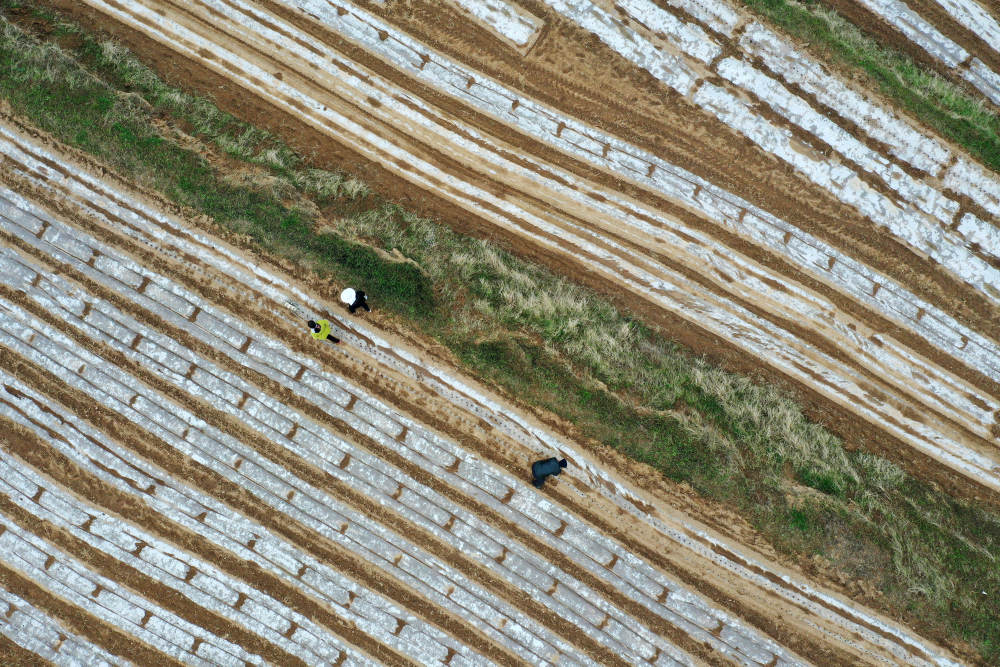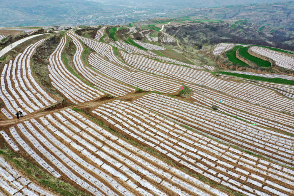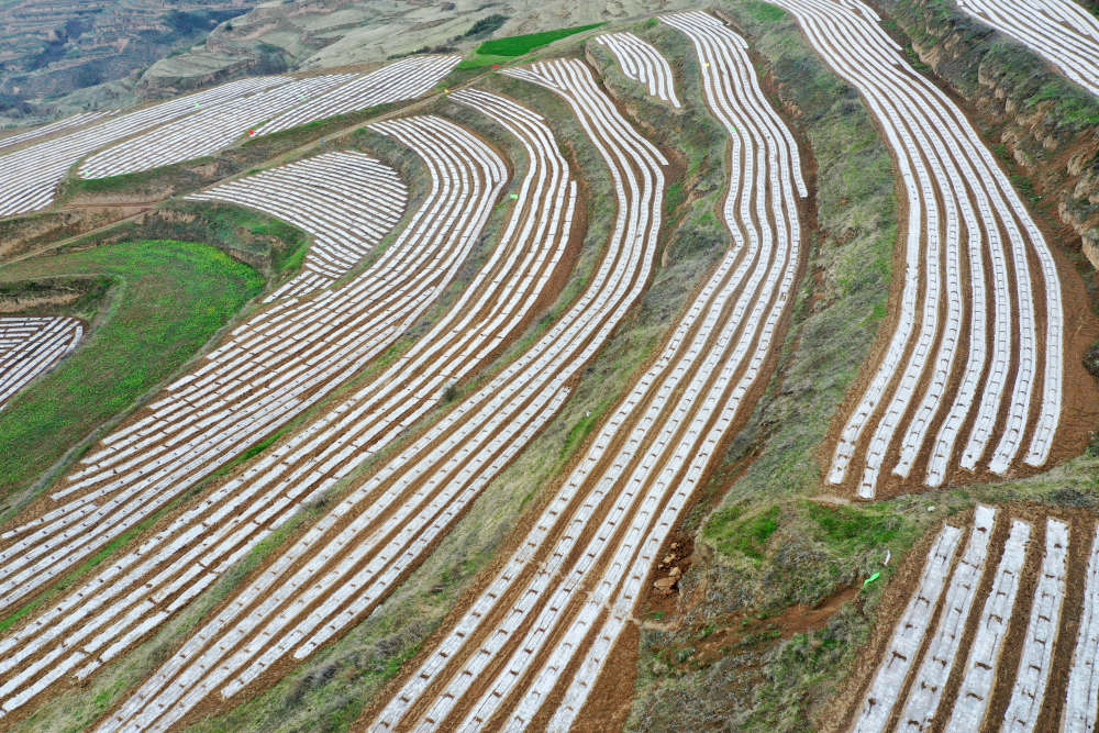在天水市秦州区天水镇,曾经的撂荒地经过合作社流转后已经覆上地膜恢复耕种(4月14日摄,无人机照片)。