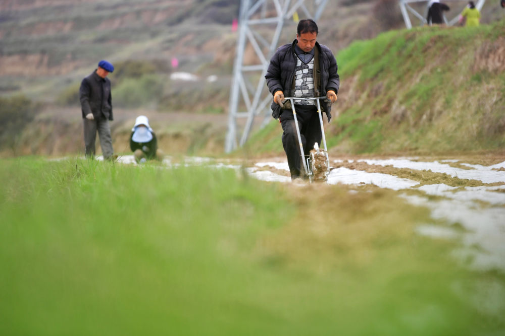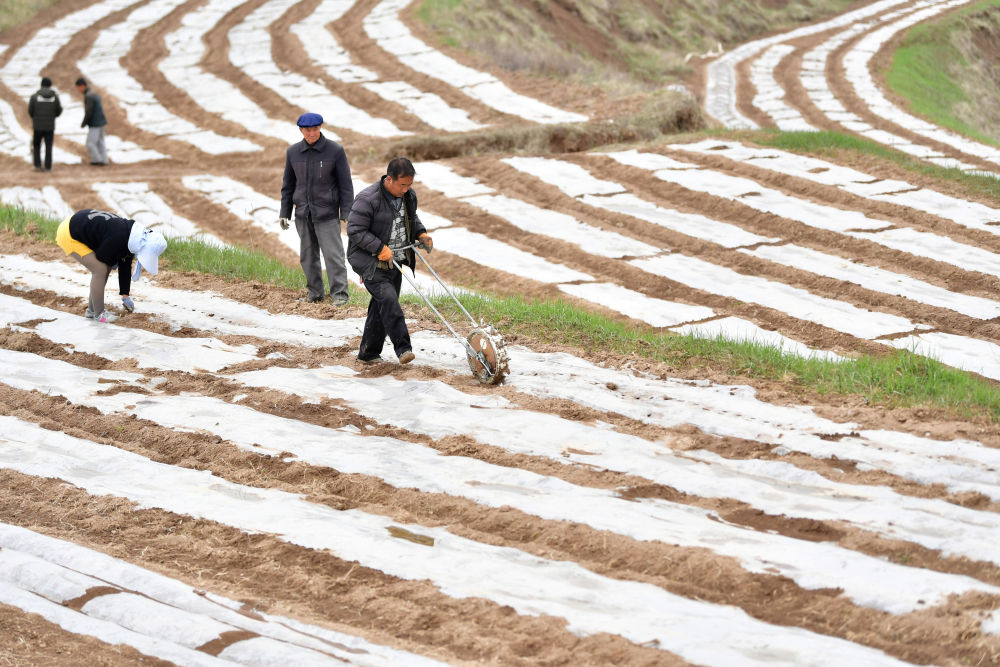 4月14日,在天水市秦州区天水镇,农民在合作社流转的复垦耕地上进行春耕生产。新华社记者 陈斌 摄