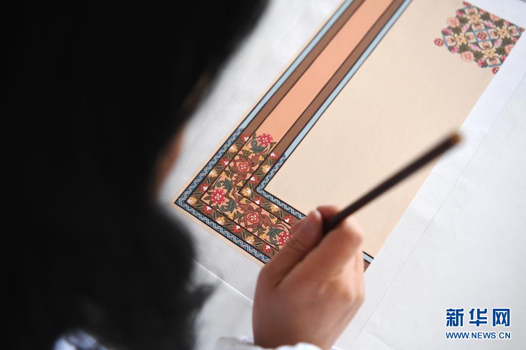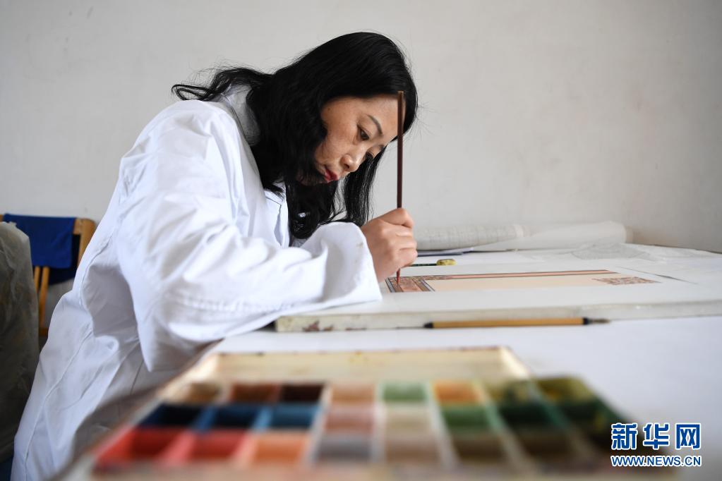 黄晶蓉在画板上给天水丝毯的设计小稿上色(4月12日摄)。新华社记者 陈斌 摄