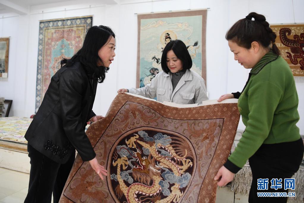 黄晶蓉(中)在天水新天丝毯有限公司的成品展室里和徒弟交流丝毯织造技艺(4月14日摄)。新华社记者 陈斌 摄