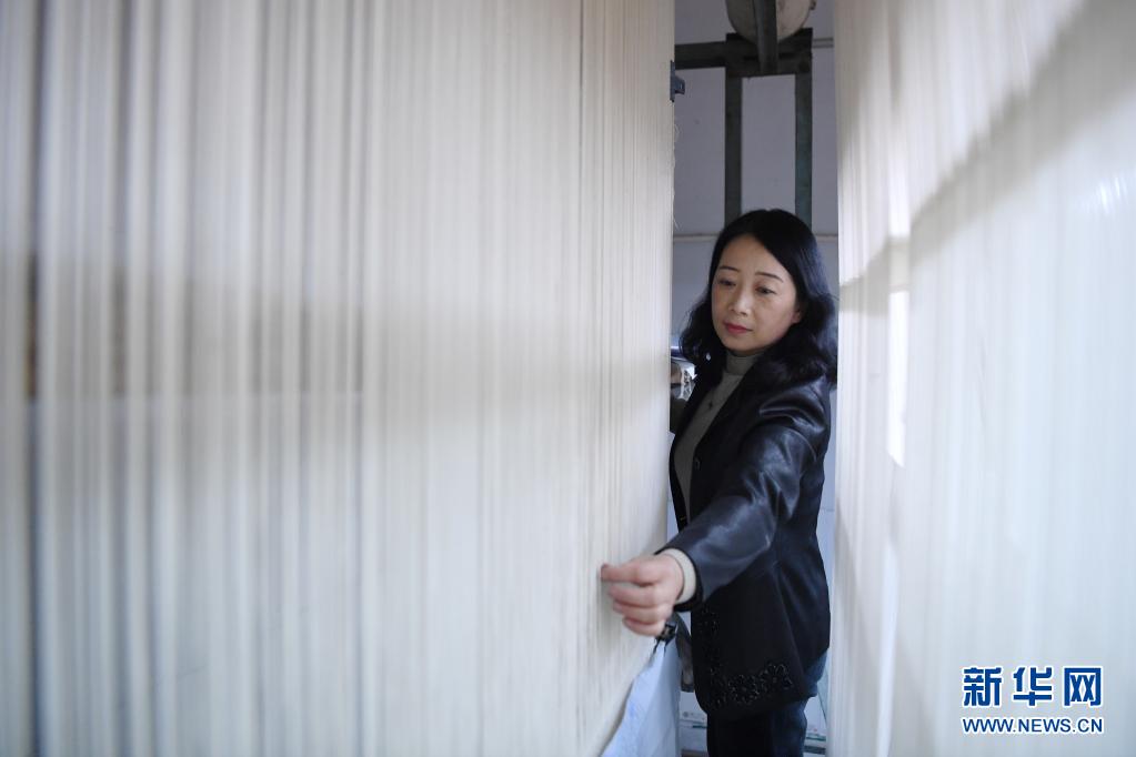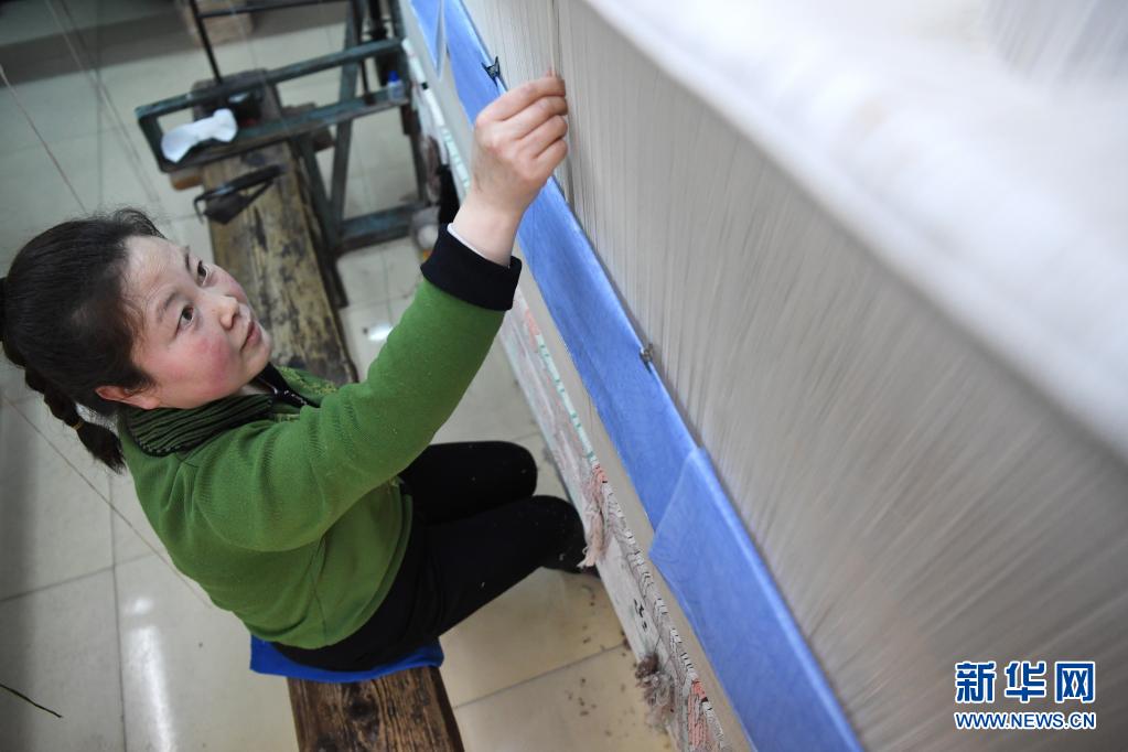 黄晶蓉在天水丝毯织造车间里在整理织线(4月12日摄)。新华社记者 陈斌 摄