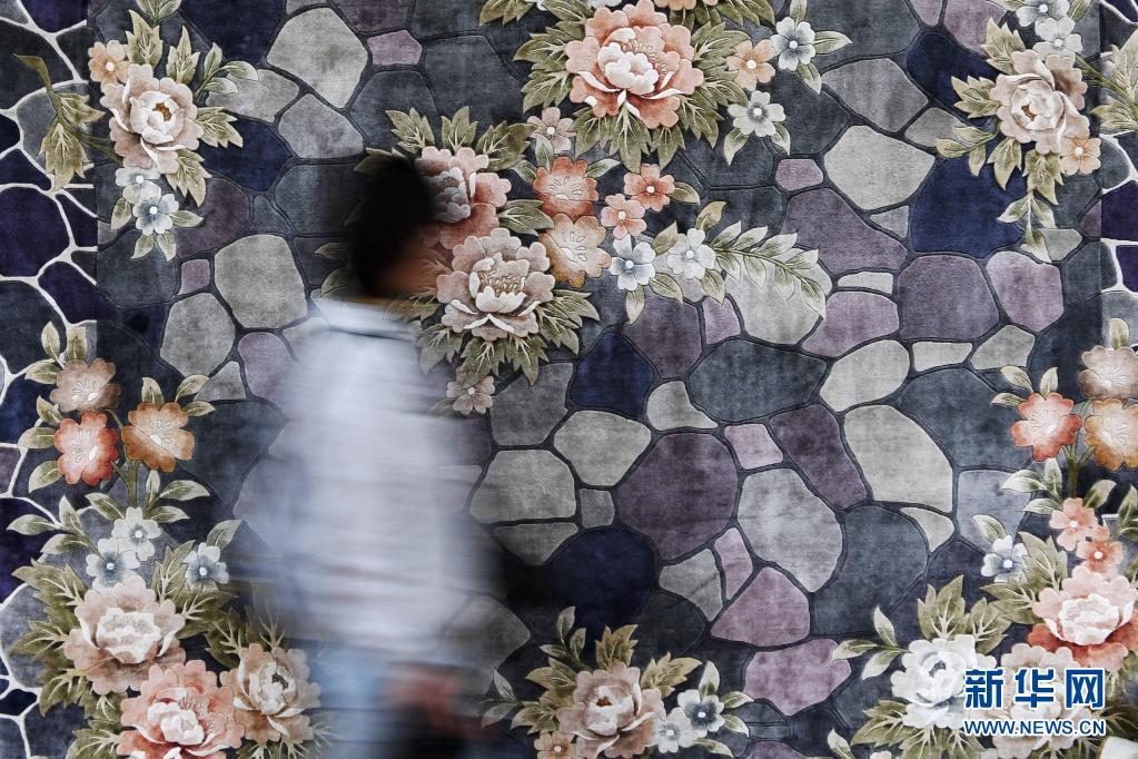 一名参观者从天水丝毯前走过(4月12日摄)。新华社记者 陈斌 摄