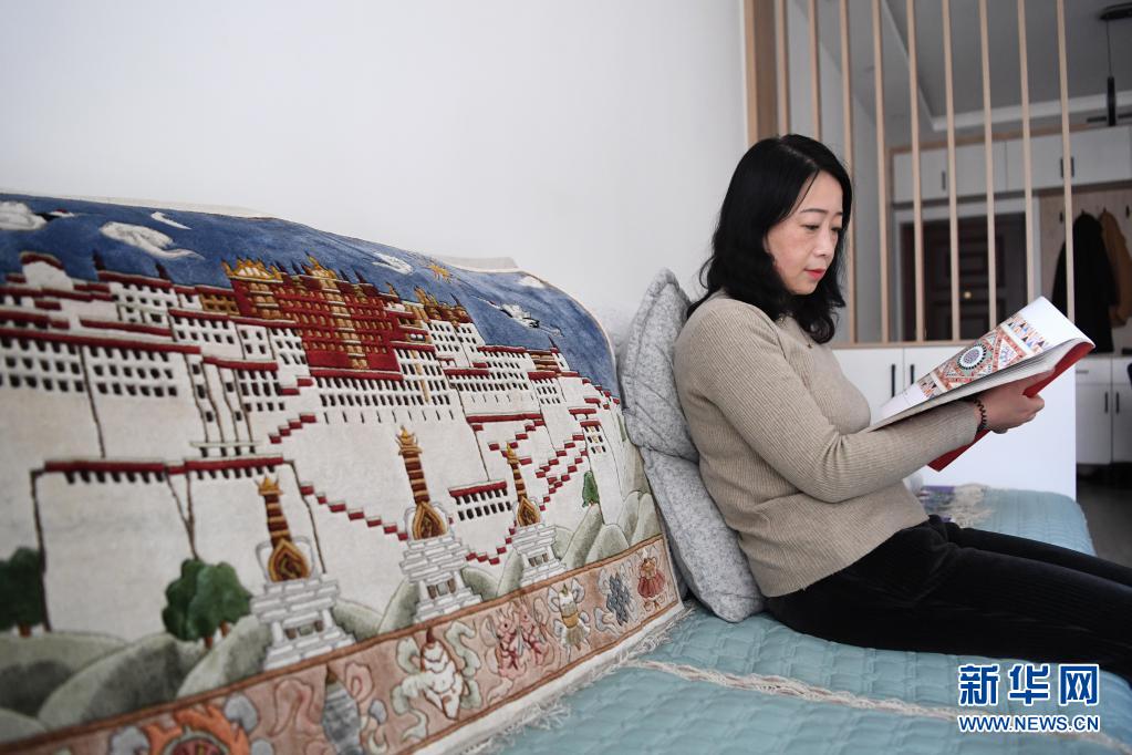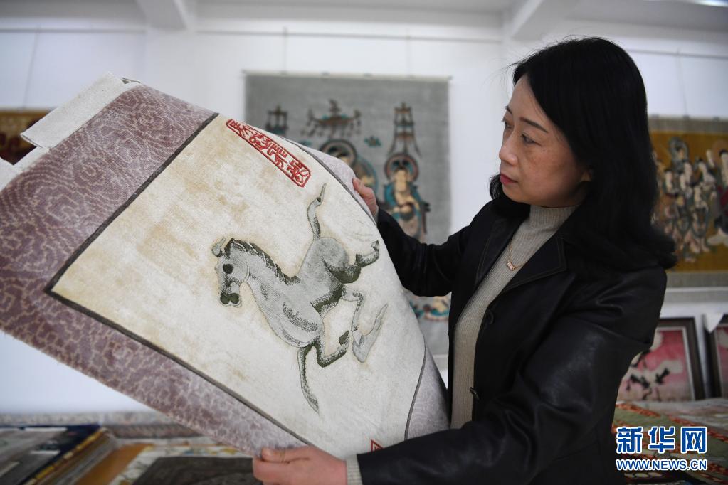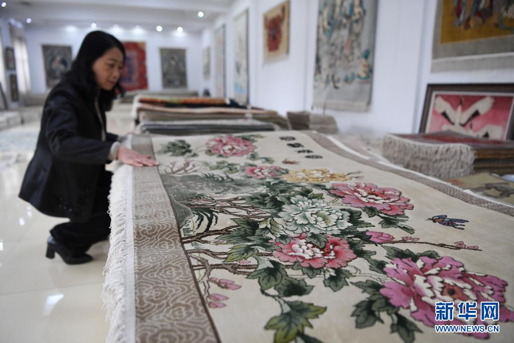 黄晶蓉在天水新天丝毯有限公司成品展室内查看丝毯成品(4月12日摄)。新华社记者 杜哲宇 摄