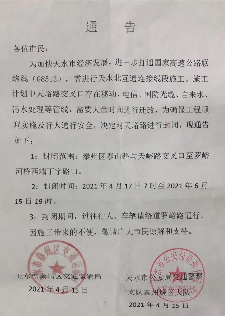 为加快天水市经济发展,进一步打通国家高速公路联络线(G8513),需进行天水北互通连接线段施工。施工计划中天峪路交叉口存在移动、电信、国防光缆、自来水、污水处理等管线,需要大量时间进行迁改,为确保工程顺利实施及行人通行安全,决定对天峪路进行封闭,现通告如下: