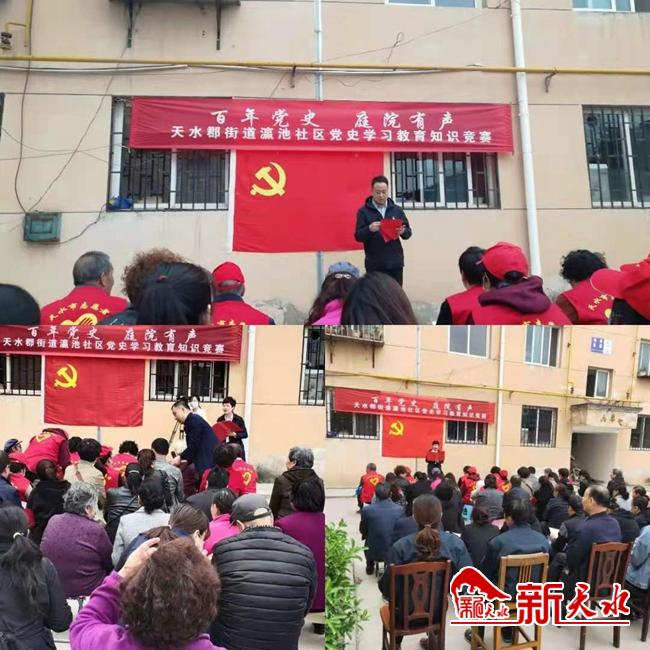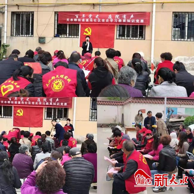 新天水讯(通讯员韩雪梅)2021年是中国共产党百年华诞,百年征程波澜壮阔,百年初心历久弥坚。 4月22日,为了迎接建党100周年,让党旗在基层组织阵地高高飘扬,瀛池社区开展“百年党史 庭院有声”党史知识竞赛活动,把策划举办党史学习主题教育“八个一”活动的党史知识竞赛搬到了庭院,让居民在“家门口”学习党史知识,让浓浓情怀充盈在温馨庭院中。