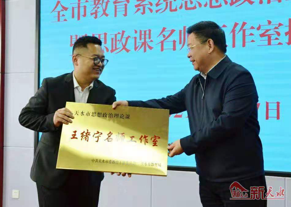 新天水讯【特约记者王建军】5月7日,天水市教育系统思想政治工作座谈会暨思政课名师工作室授牌仪式举行。天水市委常委、宣传部部长张建杰出席会议并为甘谷一中思政课老师王绪宁名师工作室授牌。