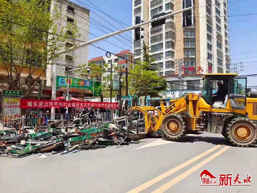 新天水讯【通讯员胡浩】5月7日,张家川县公安局城关派出所联合巡警大队,对2020年以来查获的自动麻将机、麻将等赌博用具进行了集中销毁。