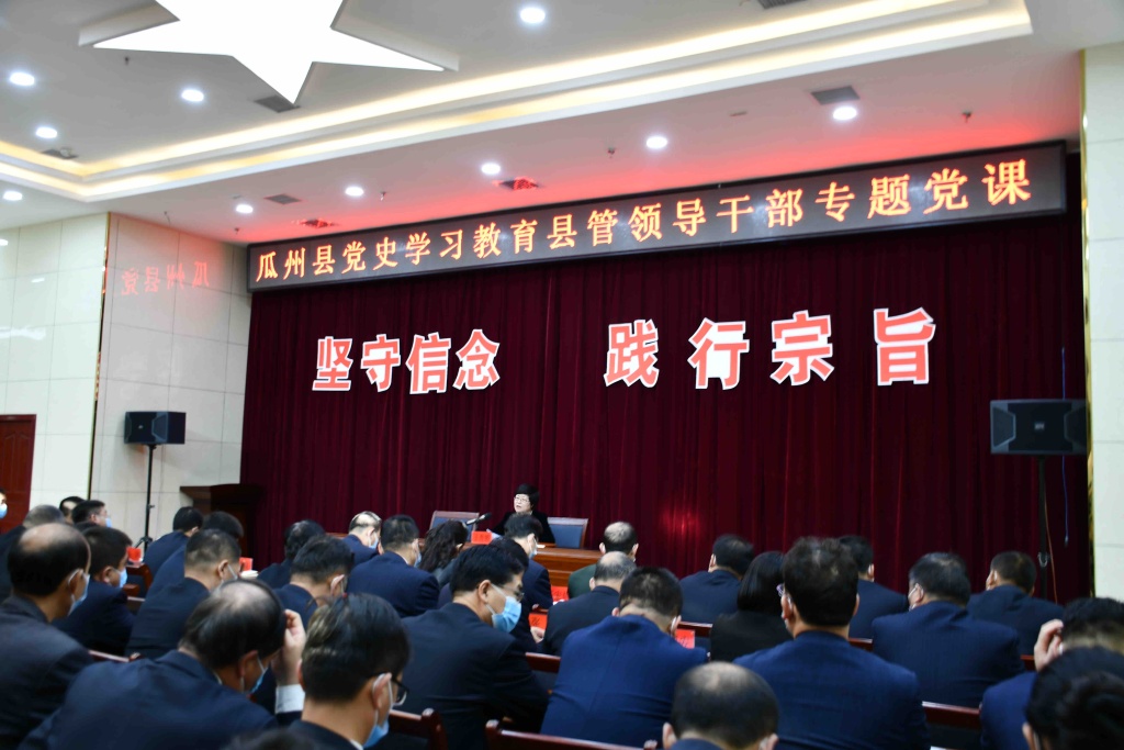 甘肃瓜州县突出把“学”作为党史学习教育切入点,在深学上下功夫、在落实上见成效。甘肃瓜州县委书记、县委党史学习教育领导小组组长王晋婷结合红西路军革命精神,聚焦甘肃瓜州县域发展实际,在红西路军安西战役纪念馆现场为全体县级领导、乡镇党委书记、各部门主要负责人讲授了《传承红西路军革命精神 凝聚高质量发展磅礴力量》专题党课。