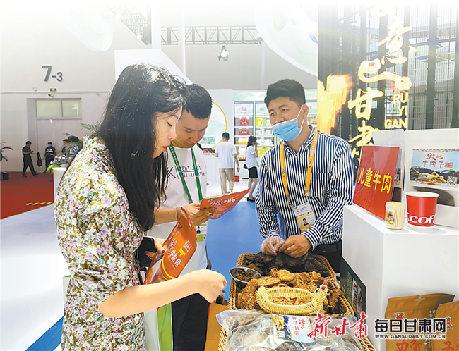 “老板,给我再装两斤五香味的牛肉干。”展馆内,泾川县旭康食品有限责任公司展位很热闹。“这个牛肉肉质很好,有嚼劲,还有五香、麻辣多个口味可以选择,真不错,我带回去让家里人也尝尝。”一位消费者高兴地说。